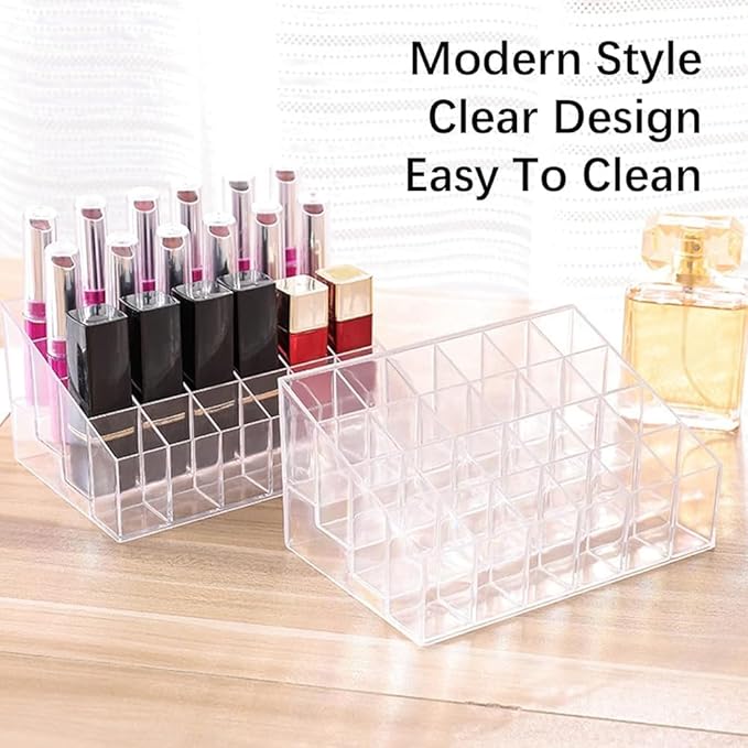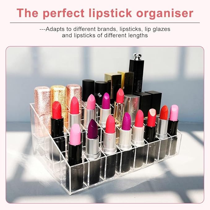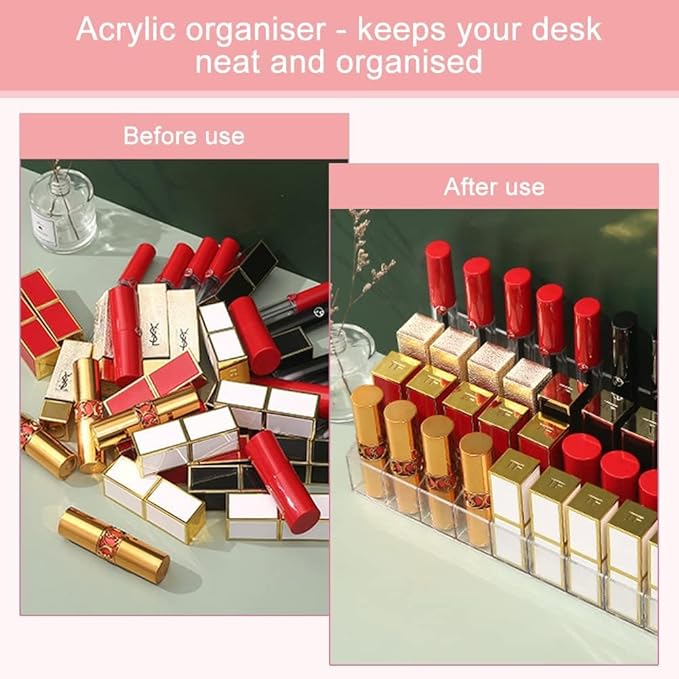 Organize your beauty collection with ease using this clear acrylic lipstick holder. Featuring 40 individual slots, this sleek organizer keeps your lipsticks, brushes, and cosmetic essentials neatly arranged and easily accessible. Its transparent design adds a modern touch, making it perfect for any dresser, vanity, or makeup station.