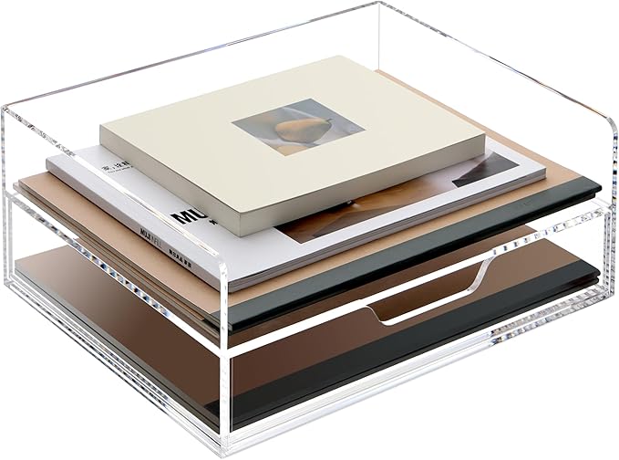 Keep your workspace clutter-free with this acrylic desk organizer with drawer, designed for both functionality and modern style. Featuring two spacious tiers, it’s perfect for storing letter-size and A4 printer paper, files, magazines, notebooks, and office supplies. The clear acrylic design adds a sleek, professional look to your desk while allowing you to easily see and access your documents.
