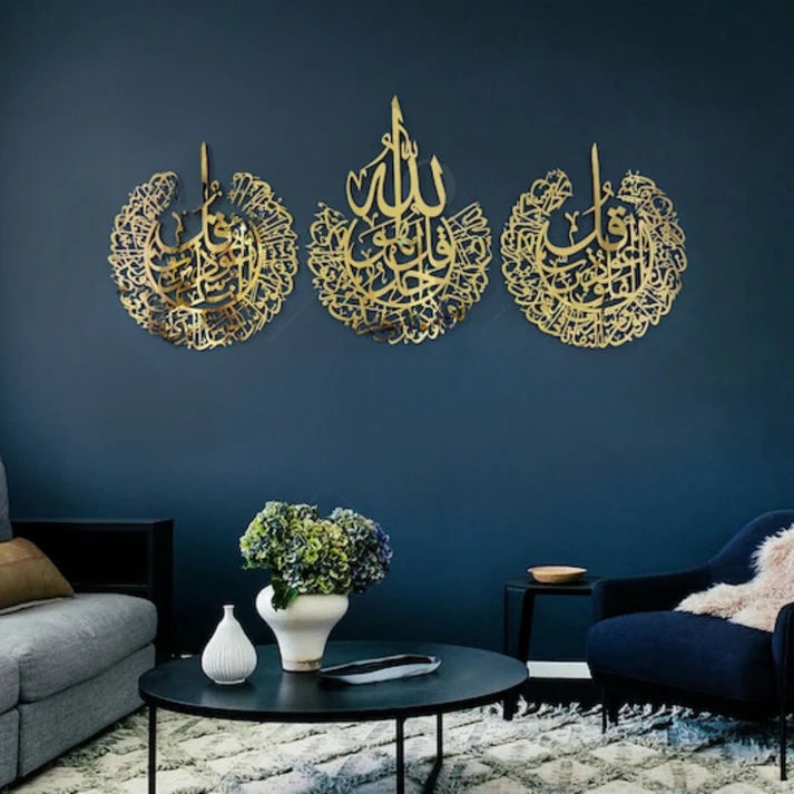Beautify your home with this elegant 3-piece Islamic wall décor set featuring Surah Falaq, Surah Nas, and Surah Ikhlas in stunning round Arabic calligraphy. These pieces serve as a spiritual reminder of protection, faith, and devotion while adding a sophisticated touch to your space.